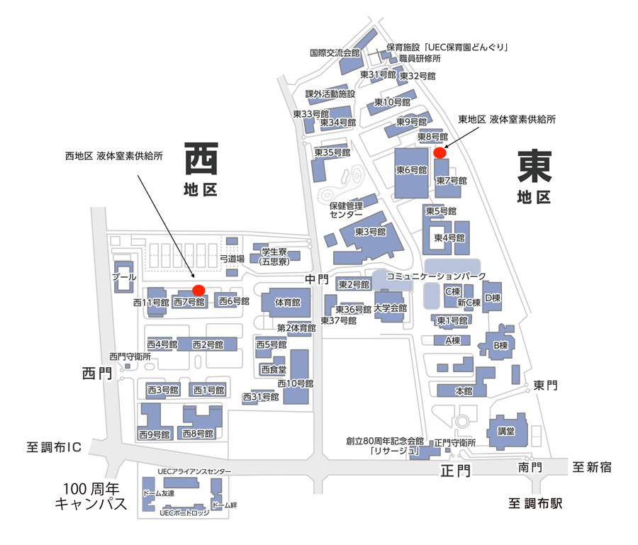 液体窒素供給所は東地区と西地区に設置しています。地区を超えての液体窒素容器移動はお控えください。